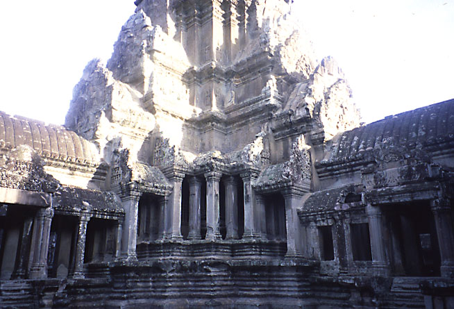 アンコール・ワット第三回廊の塔。 もともとはヒンズーの寺院として建立されたが、 その後仏教の伝来に伴って仏像が安置され、 現在では仏教徒の聖地として 参拝者を集めている。