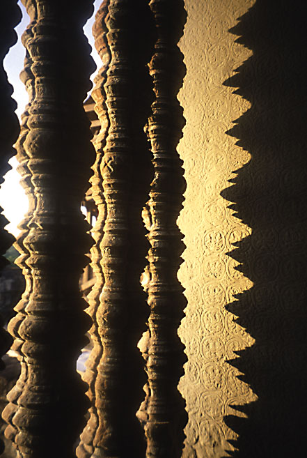 アンコール・ワット第三回廊の連子窓。 窓に入っている格子のような装飾は、 中からは外が見え、外からは中が見えない 巧妙な仕掛けになっている。 右側のギザギザ部分は、 柱が夕陽を受けてできた影。